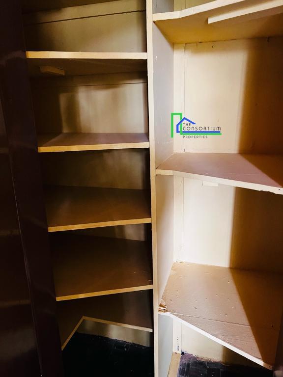 Modern kitchen with built-in units, heat extractor, pantry, and provision for a dishwasher.