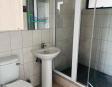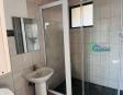 The flat has an open plan living room and kitchen, a guest bathroom with a bath tub, a guest bedroom with built in closets, and an en suite main bedroom with a closet and bathroom with a shower.